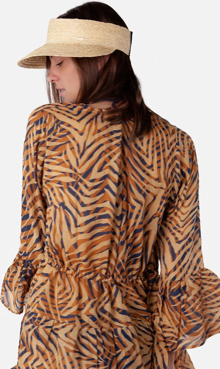 De Peona Visor is een raffia zonneklep met een elastische band aan de achterkant.