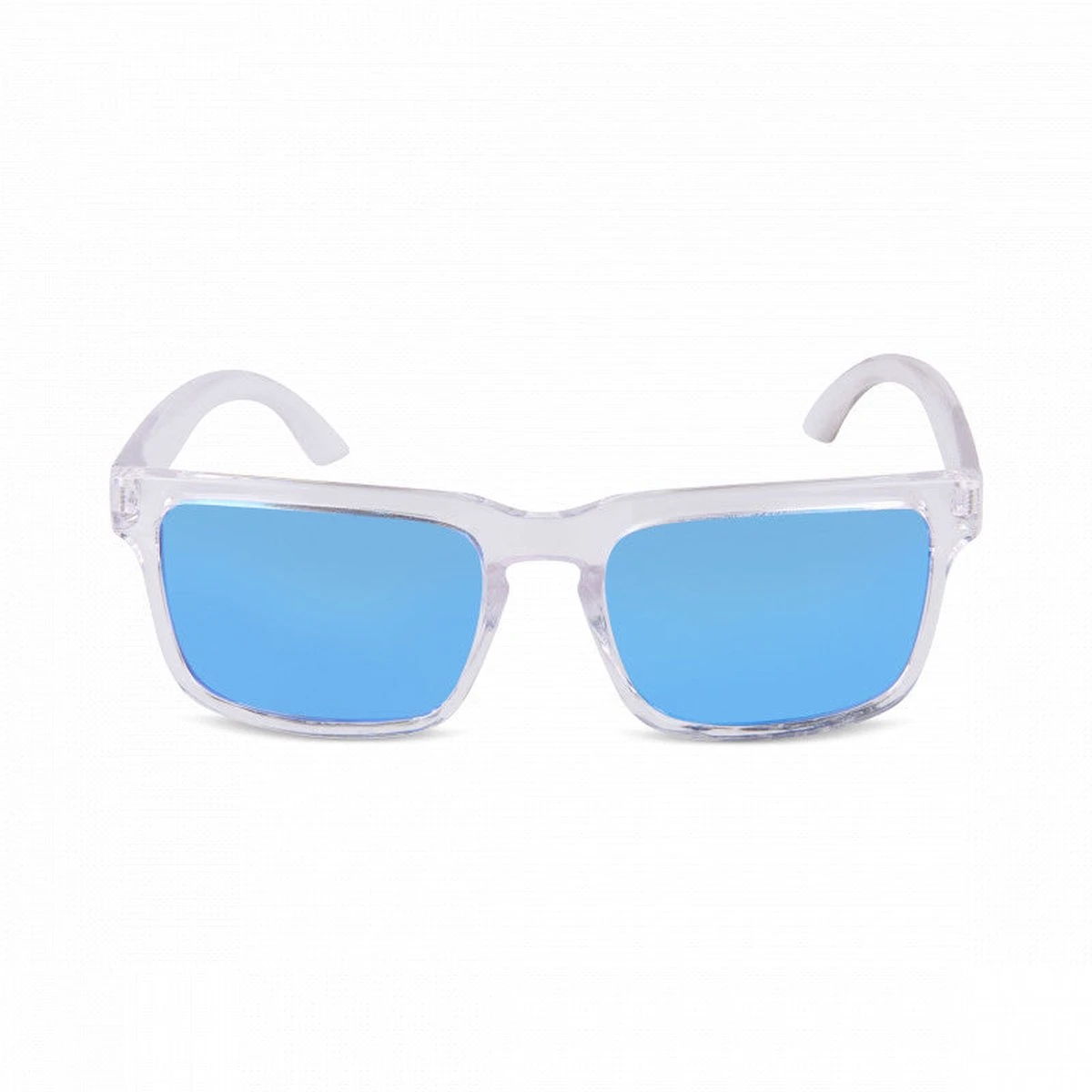 Gepolariseerde zonnebril met blauwe spiegelglazen en een transparant montuur