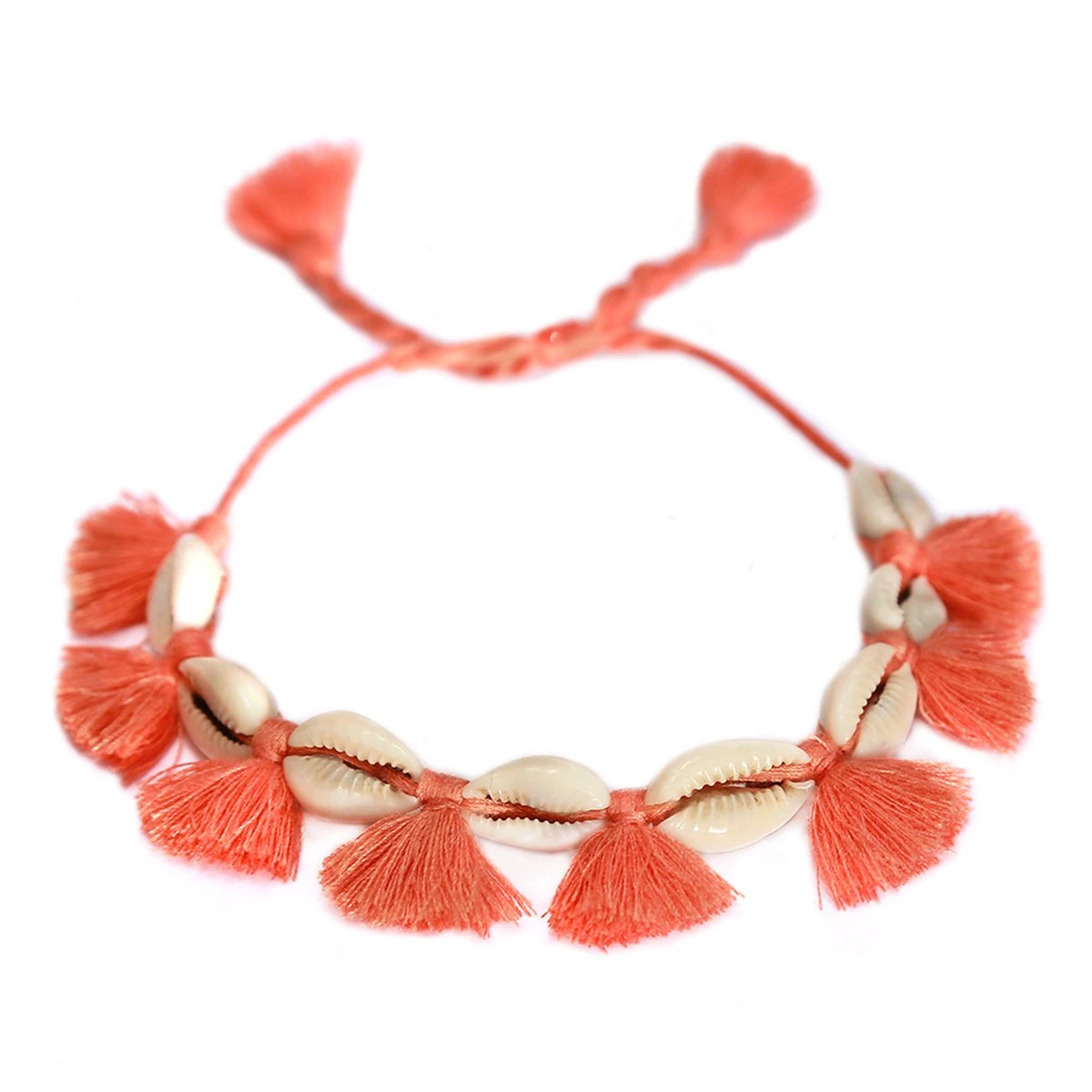 Speels enkelbandje met schelpjes die afgewisseld worden met kwastjes.