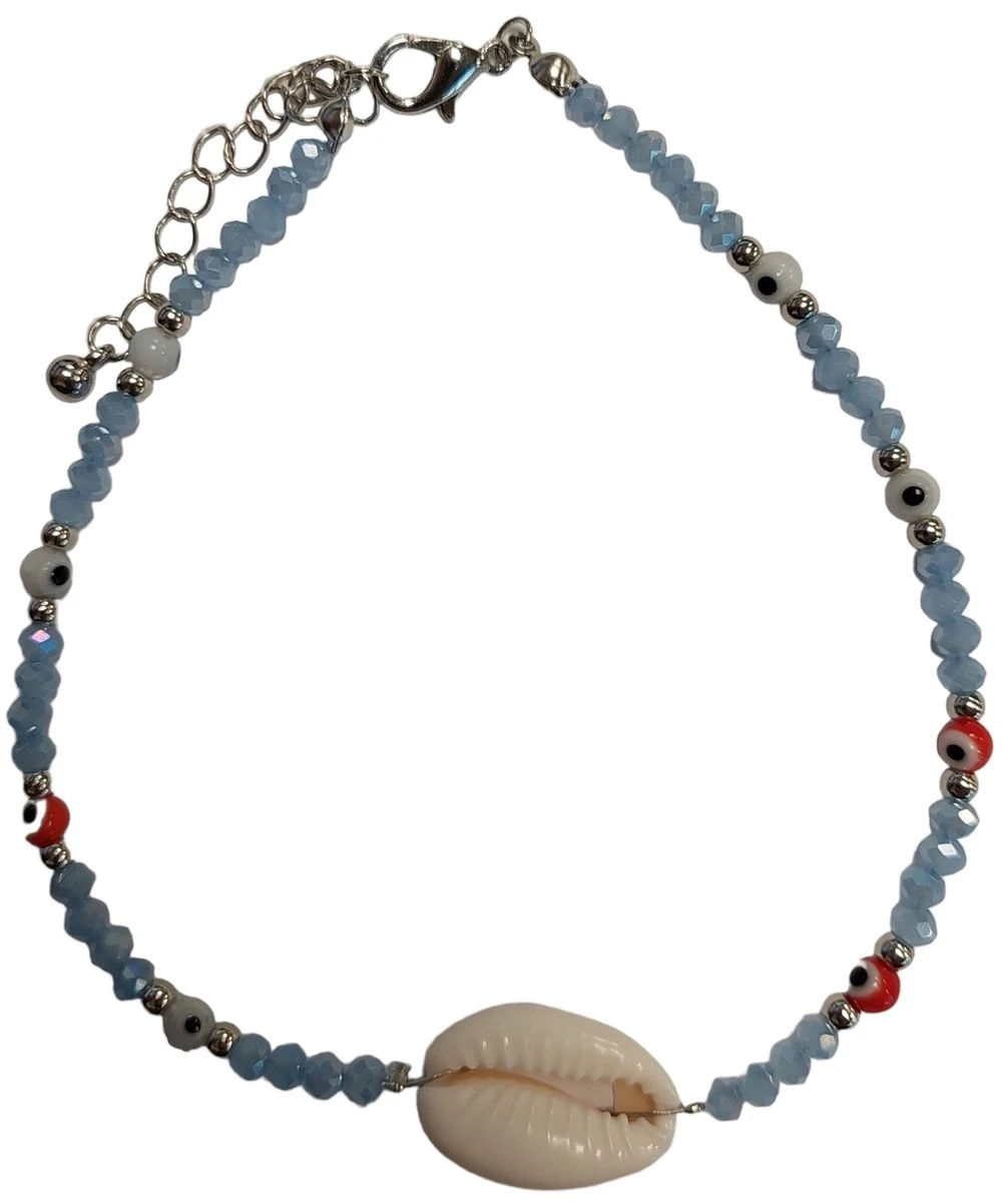 Enkelbandje – Schelp En Glaskralen – Anklet – Lengte 25-30 Cm – Blauw