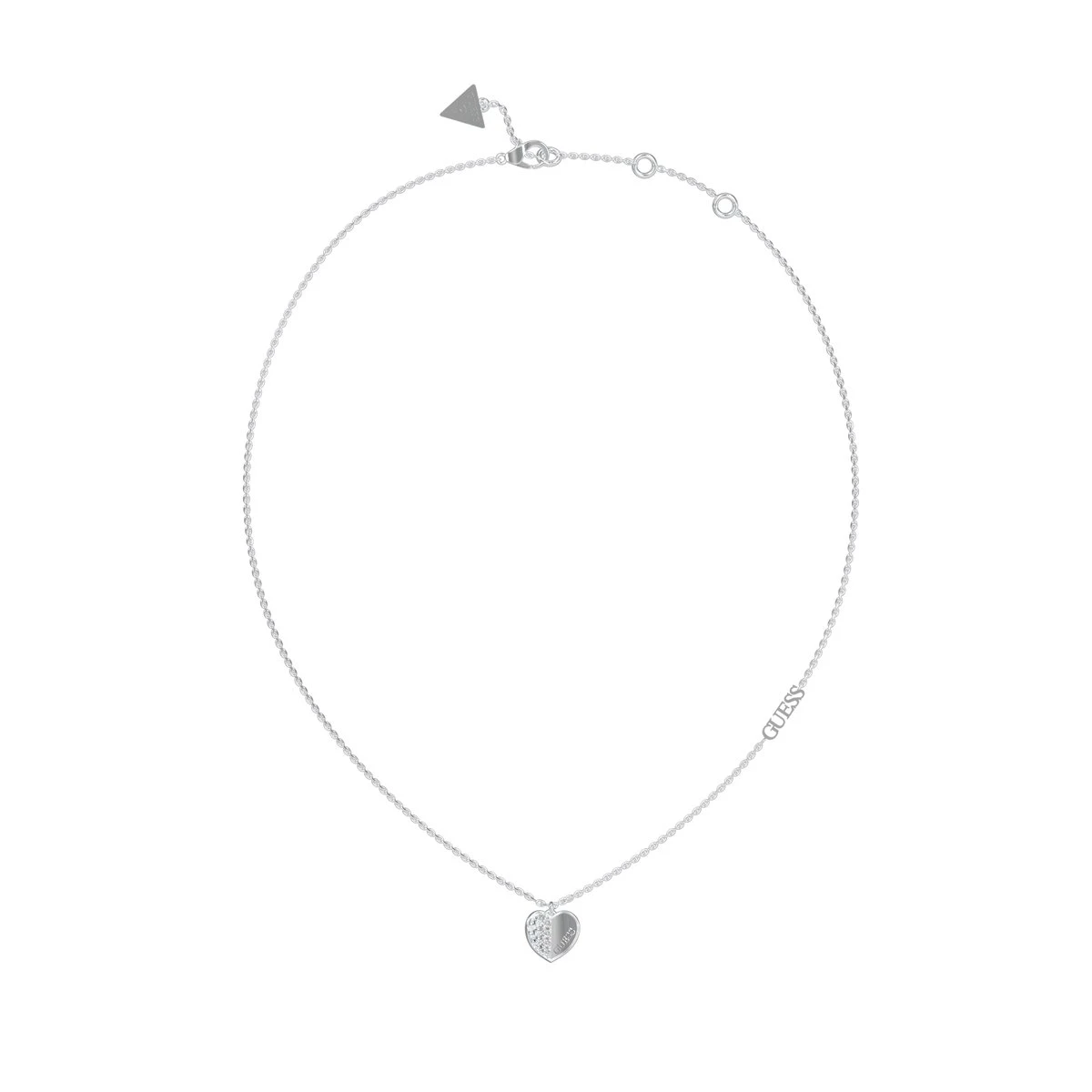 Een fijn design, dit collier uit de LOVELY GUESS collectie van Guess Jewellery. Het zilverkleurige collier heeft in het midden een hart bedel gegrafeerd met het Guess logo, de helft van de bedel is gezet met schitterende kristallen. De band is verstelbaar van 14,6 cm tot 18,4 cm en sluit middels een karabijnsluiting.