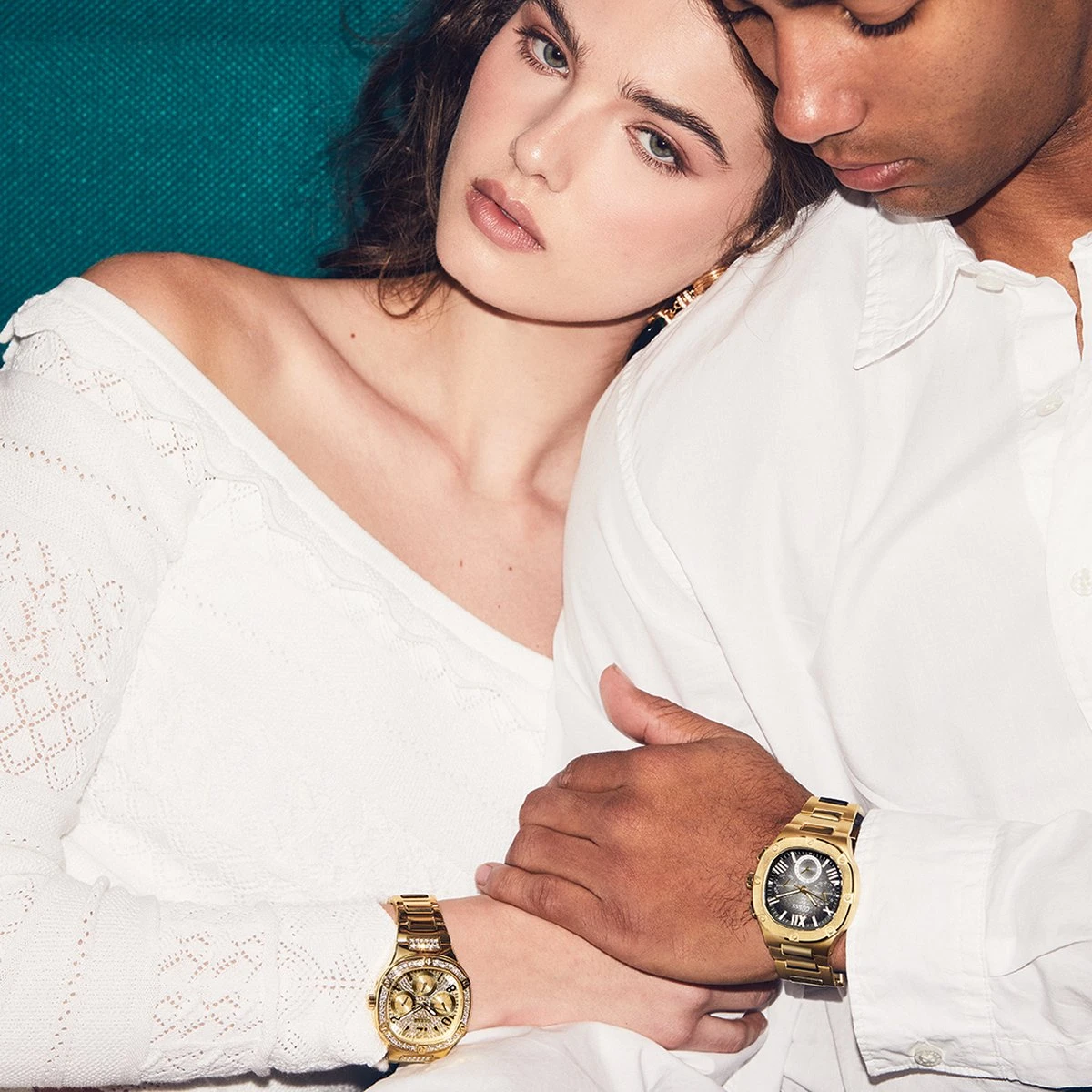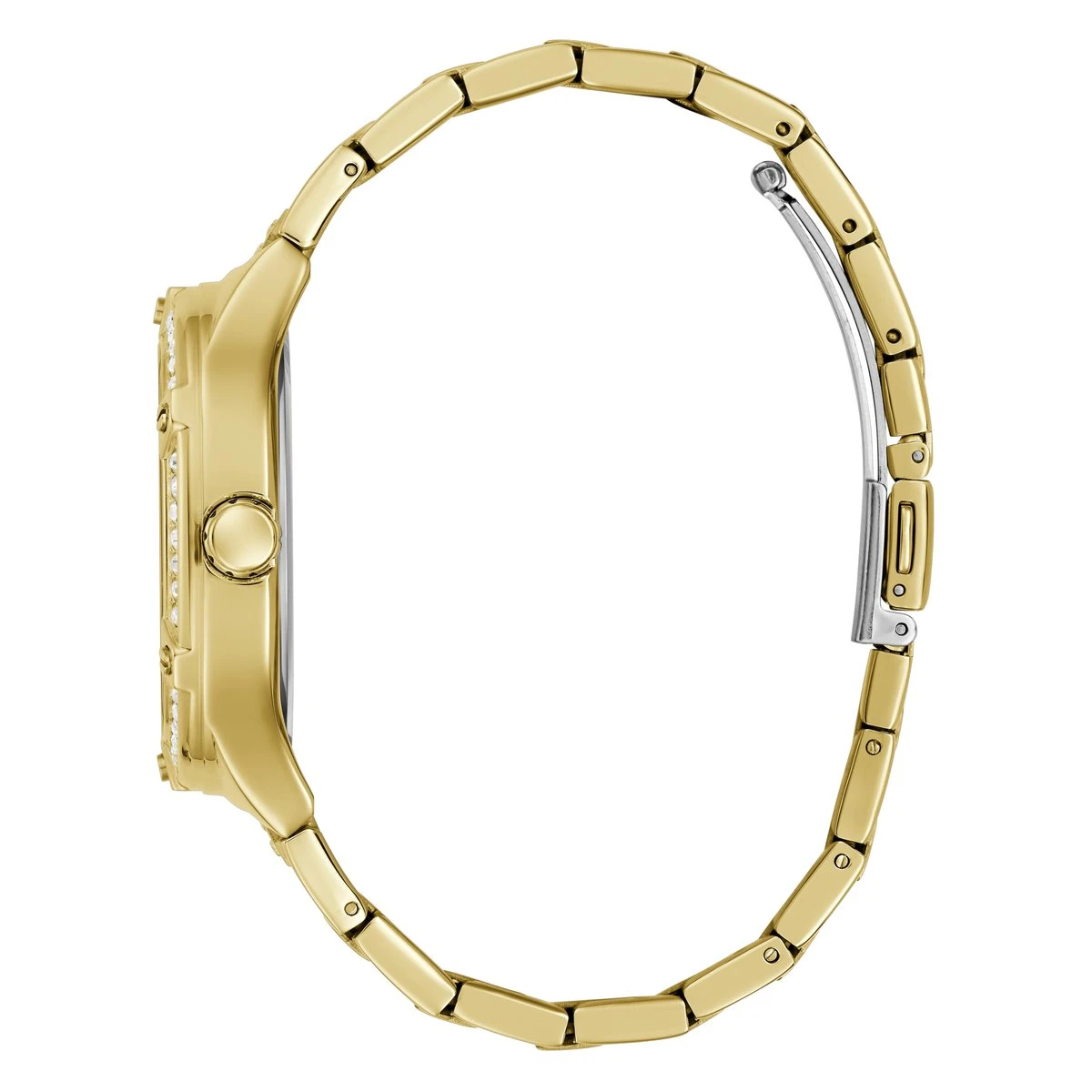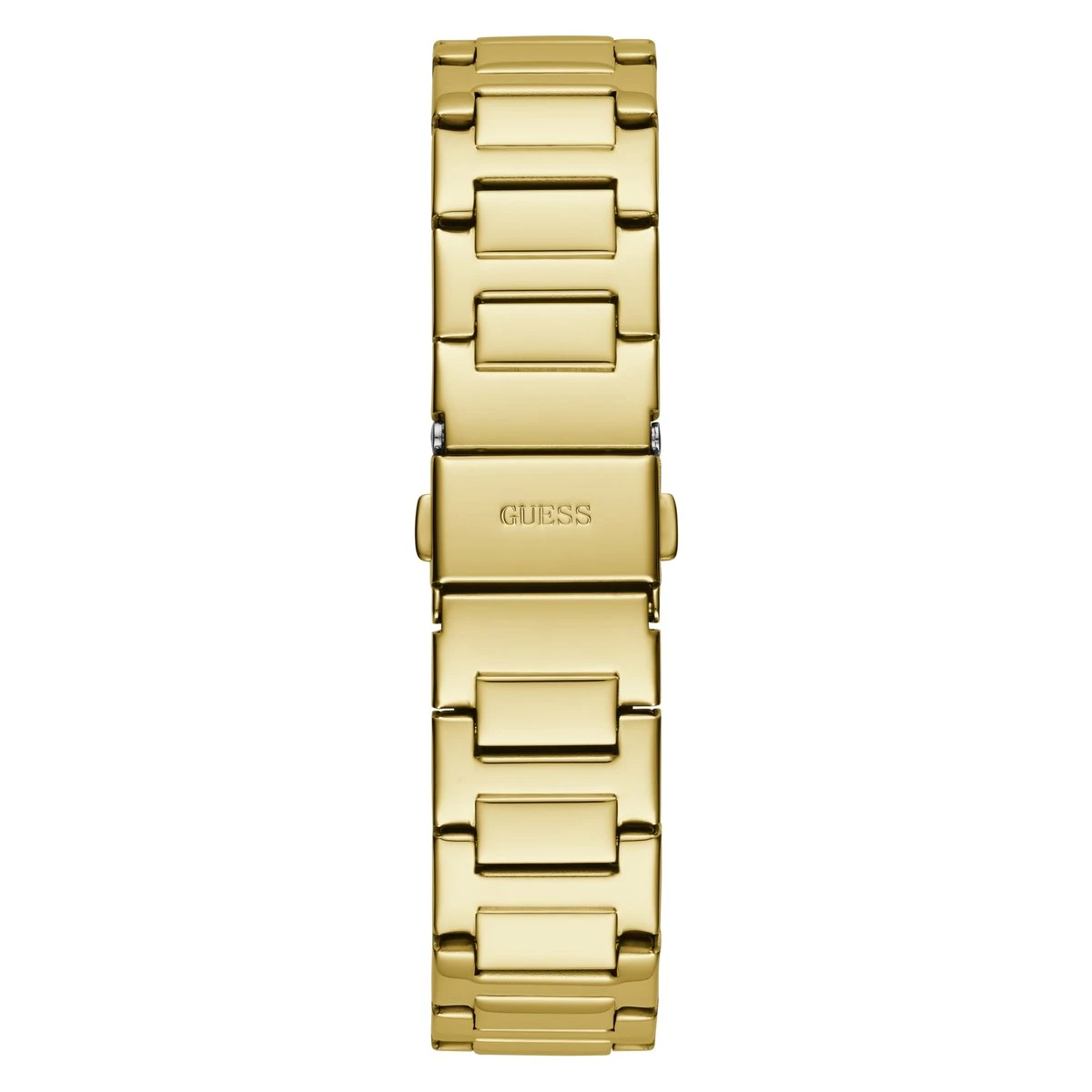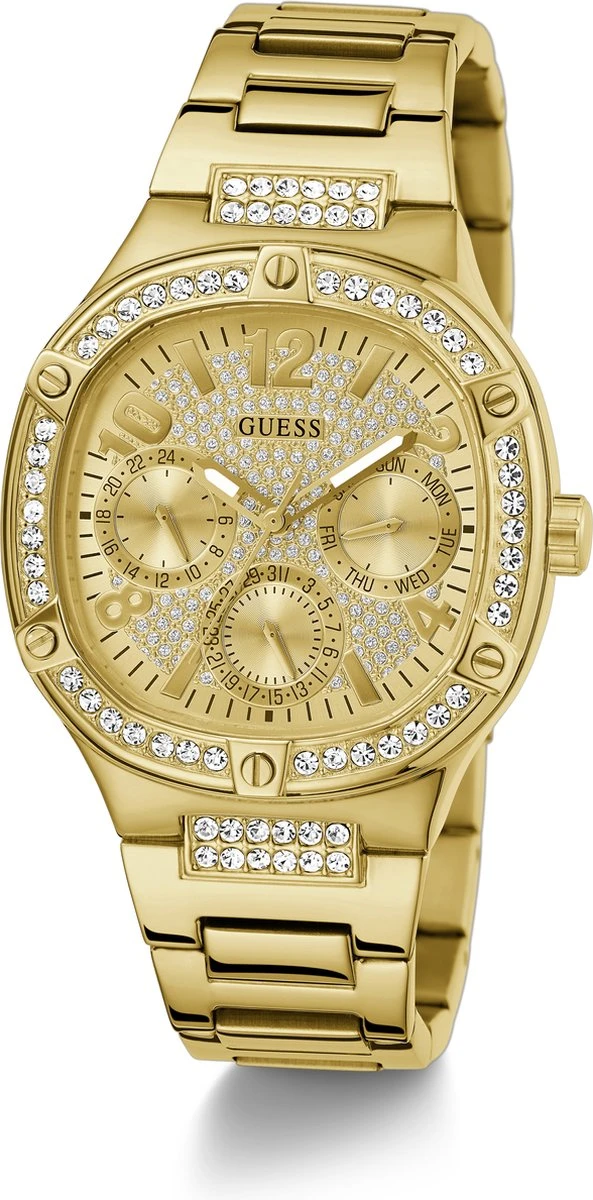 Bling “it is” dit vierkante dames model van Guess is een chique fashion statement. Dit goudkleurige model uit de “DUCHESS” serie heeft een kastmaat van 40 mm x 40 mm welke voorzien is van een lunet met een rij schitterende kristallen en schroefdetails. De wijzerplaat heeft dag, datum en 24 uursaanduiding. De goudkleurige band is opgebouwd uit schakels en vouwt middels een vouwsluiting.