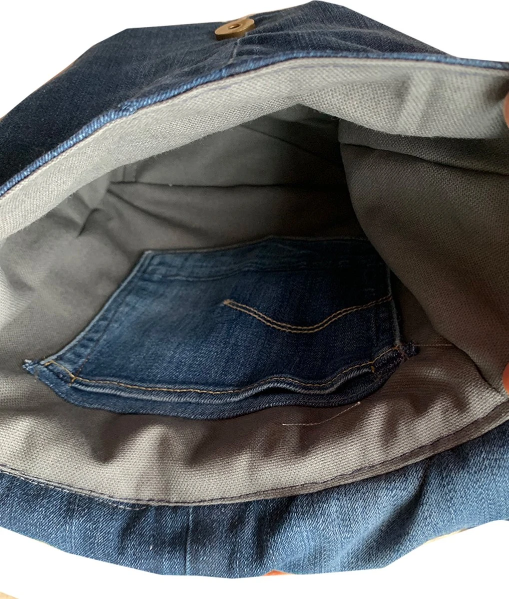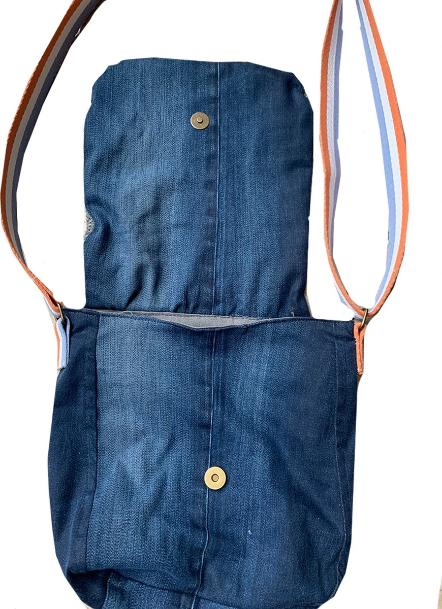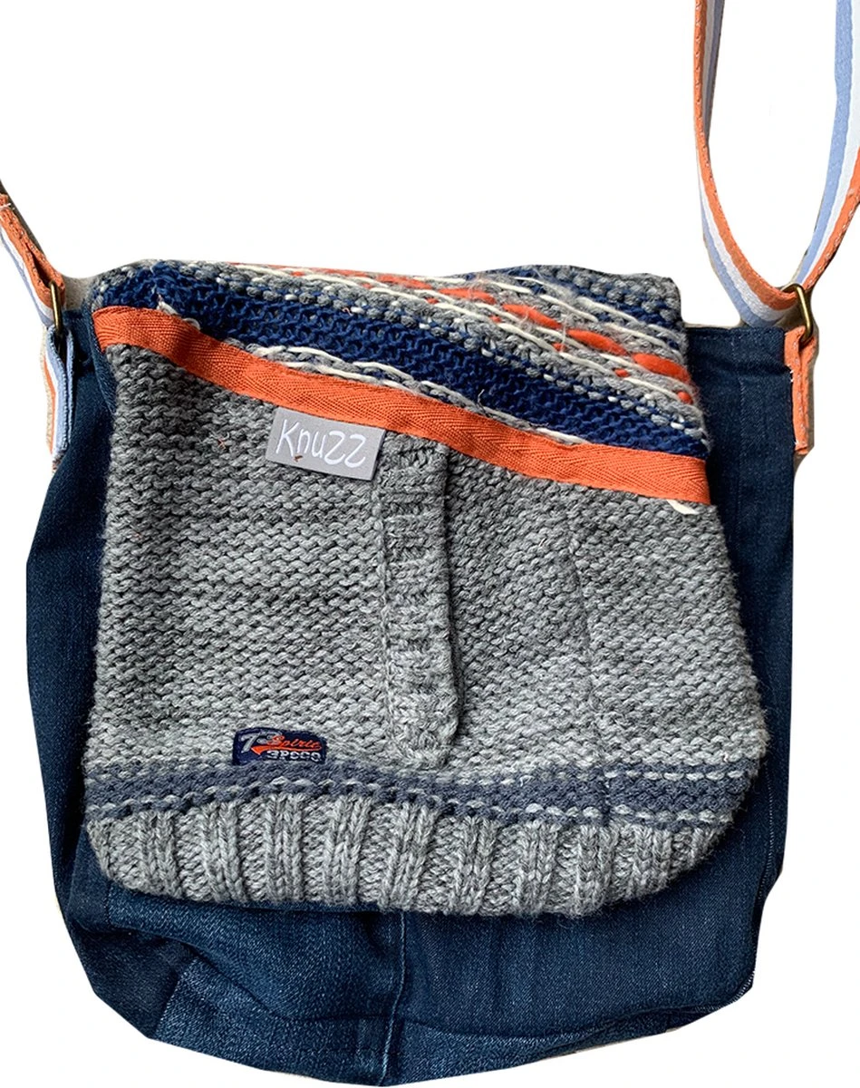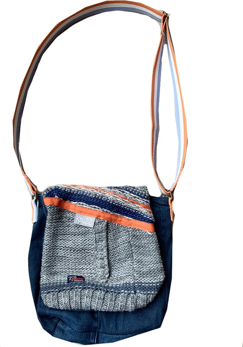Handgemaakte sportieve schoudertas van gerecyclede trui en spijkerbroeken. De tas heeft een binnenzak en sluit door middel van magneetsluiting. De schouderriem is verstelbaar.