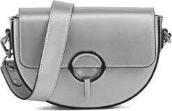 Damestas model Ambra in de kleur zilver van Lina Locchi AfmetingenDe afmetingen van deze tas bedragen 20 cm x 6 cm x 12 cm (LxBxH). BeschrijvingCrossbody tas met hanger voor dames van het merk Lina Locchi. Deze zilverkleurige tas is uitgevoerd in leer. De tas is af te sluiten met de zilverkleurige decoratie aan de voorzijde. De tas komt met een schouderhengsel in dezelfde kleur. De binnenzijde is uitgevoerd in stof en bevat een kleiner vakje welke is af te sluiten met een rits. De achterzijde van tas bevat tevens een extra vakje met rits. Verder is deze tas afgewerkt met goudkleurige details.
