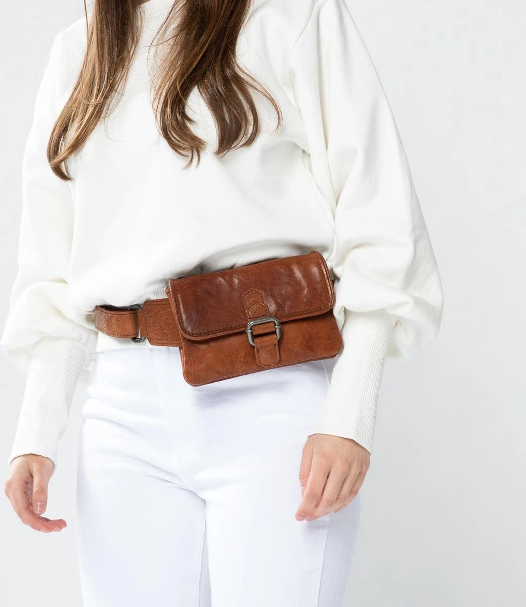 Stijlvol heuptasje van het merk Manfield. Dit cognackleurige heuptasje heeft een binnenzijde van textiel en een buitenzijde van leer. Het tasje bestaat uit twee delen. Het eerste deel sluit je met een magnetische sluiting. Dit deel bestaat uit één groot vakje. Op de achterkant van het heuptasje bevindt zich nog een vakje. Dit bestaat uit één groot en één kleiner opbergvakje met ritssluiting. Het tasje heeft een verstelbare band met een totale lengte van 96 cm. De afmetingen van het heuptasje zijn 11x19x3cm (hxbxd).