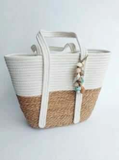 Mooie grote zomerse strandtas in een bohemian Ibiza stijl. De tas is gemaakt van natuurlijke materialen kantoen en riet en daardoor sterk en duurzaam. De tas heeft een mooie afwerking van creme kleurige details en een fraaie schelpenhanger in pastelkleuren. Deze grote tas heeft een open bovenkant en heeft genoeg ruimte voor alle jouw spullen tijdens een zomerse stranddag.