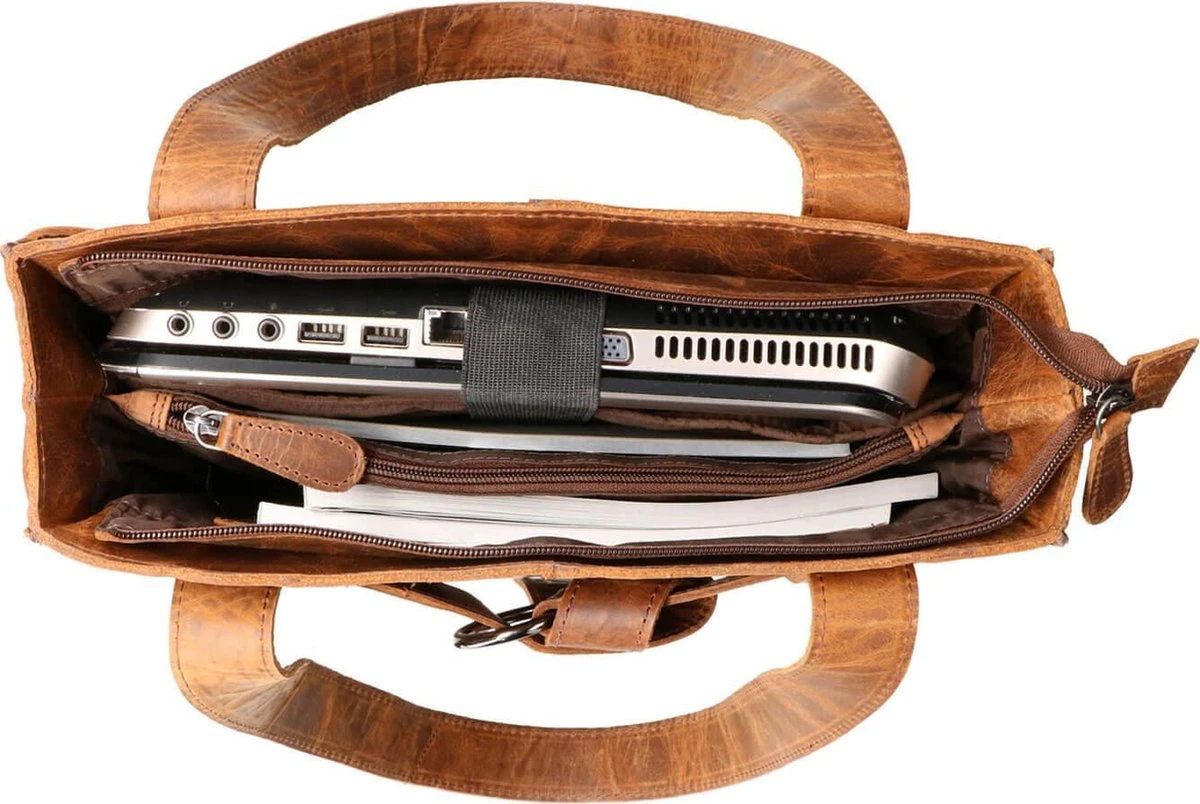 Een hoog model dames werktas met laptop vak. Dit is een model met een trendy touche. De tas heeft een riem aan de boven zijde met een knoop. Apart en zeker trendy. Deze sierriem is verwisselbaar en of afneembaar. Deze tas heeft geen lange schouderband. Is ook niet nodig omdat de korte plat leren banden lang genoeg zijn om de tas comfortabel aan de hand of over de schouder te dragen. De tas heeft een hoofdvak met een tussen ritsvak, een laptopvak, een tablet vak en twee insteekvakken. De achterzijde heeft nog een ritsvak. Deze tas is uitgevoerd in croco print. Het hunter leer is super mooi en heeft een diepe glans. Met het juiste onderhoud heeft u jaren plezier aan deze super gave werktas van Leather Design. Kenmerken: – Afmetingen: 30 x 39 x 11 CM – Laptop vak 15 inch – Gemaakt van: Leer – Afsluiting: Rits