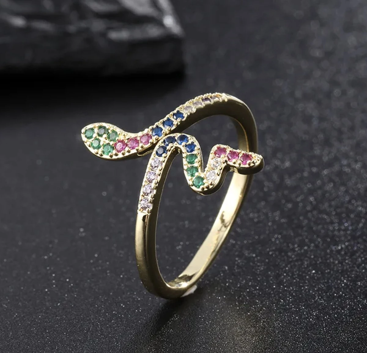 Ring dames | zilveren dames ring | gold plated | goudkleurig | slang ring | Zirkonia stenen multikleur | statement ring | verstelbare ring | one size ring | cadeau voor vrouw