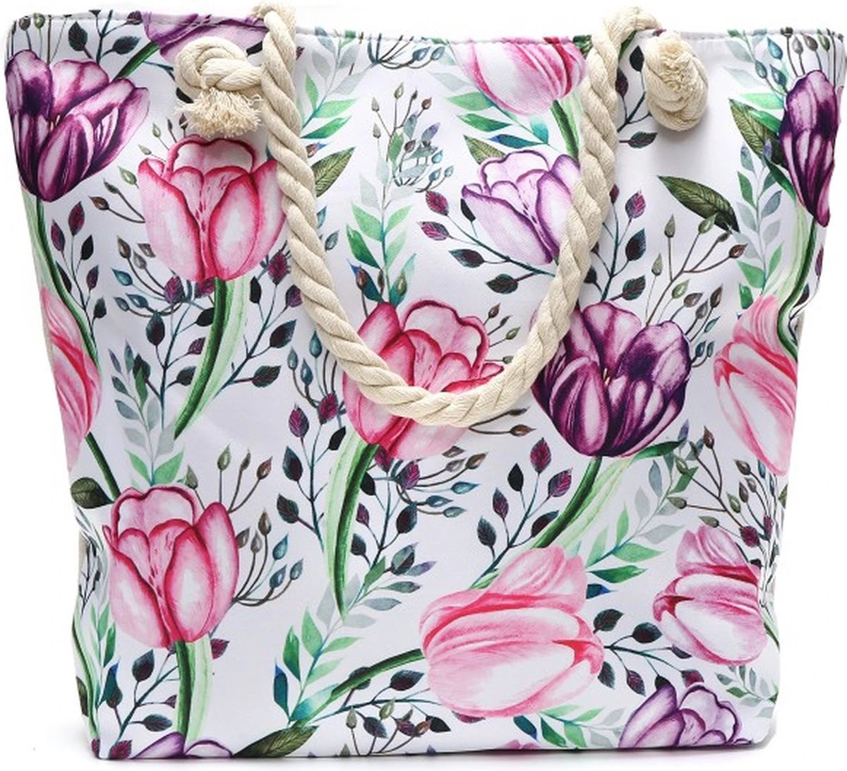 Strandtas Met Rits – Beach Bag – Bloemen – Roze – Paars – 44 X 36 X 12 Cm