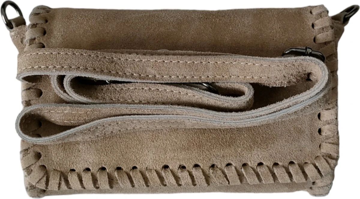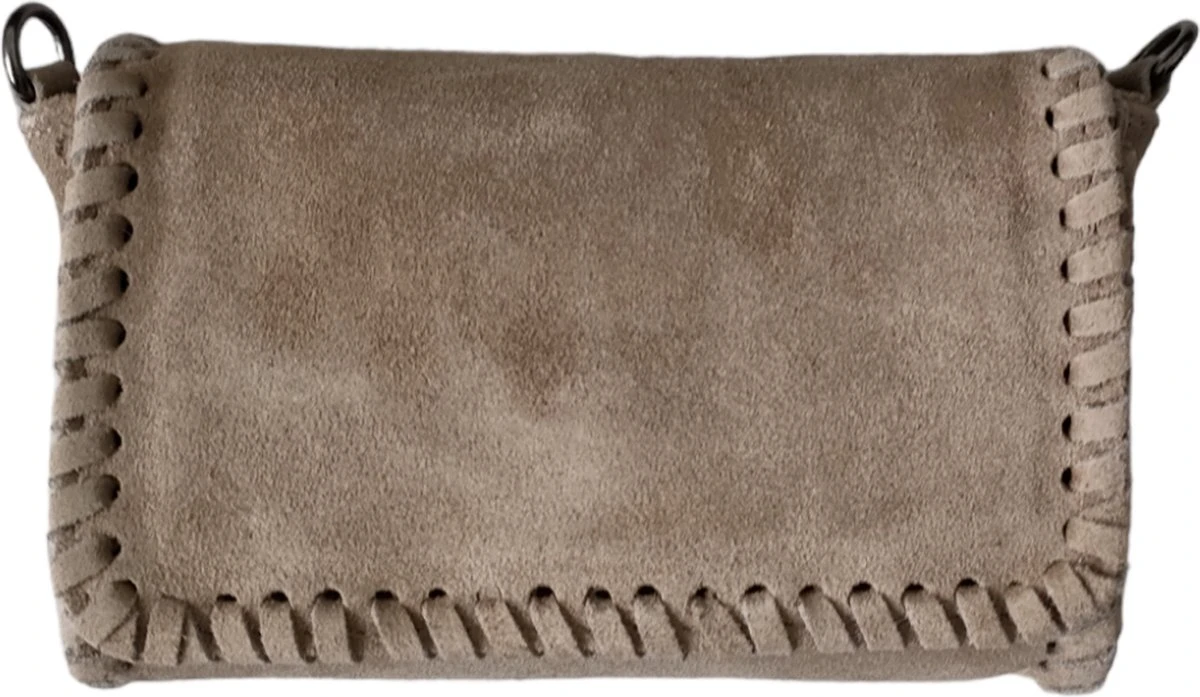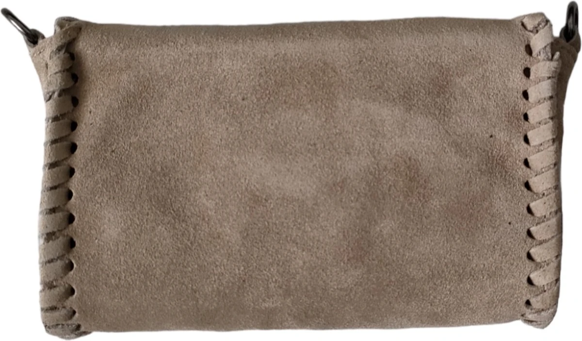 Mooie tas van super mooi zacht suède in de mooie kleur Zand. De afwerking geeft hem die speelse look. De tas heeft een afneembare/verstelbare schouder riem. Hierdoor kan ook als clutch of cross body gedragen worden.