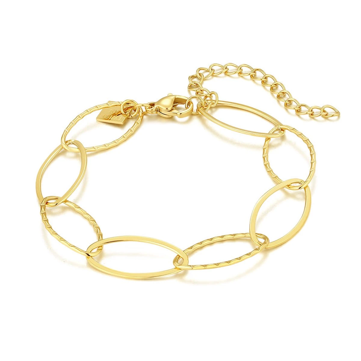 Armband in goudkleurig edelstaal, effen en gebeitelde ovale schakels, verstelbaar.