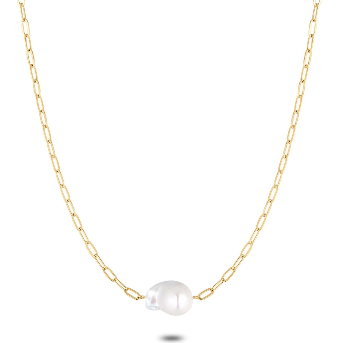Halsketting in goudkleurig edelstaal, ovale schakels, 1 grote parel + 1 kleine parel, verstelbaar.