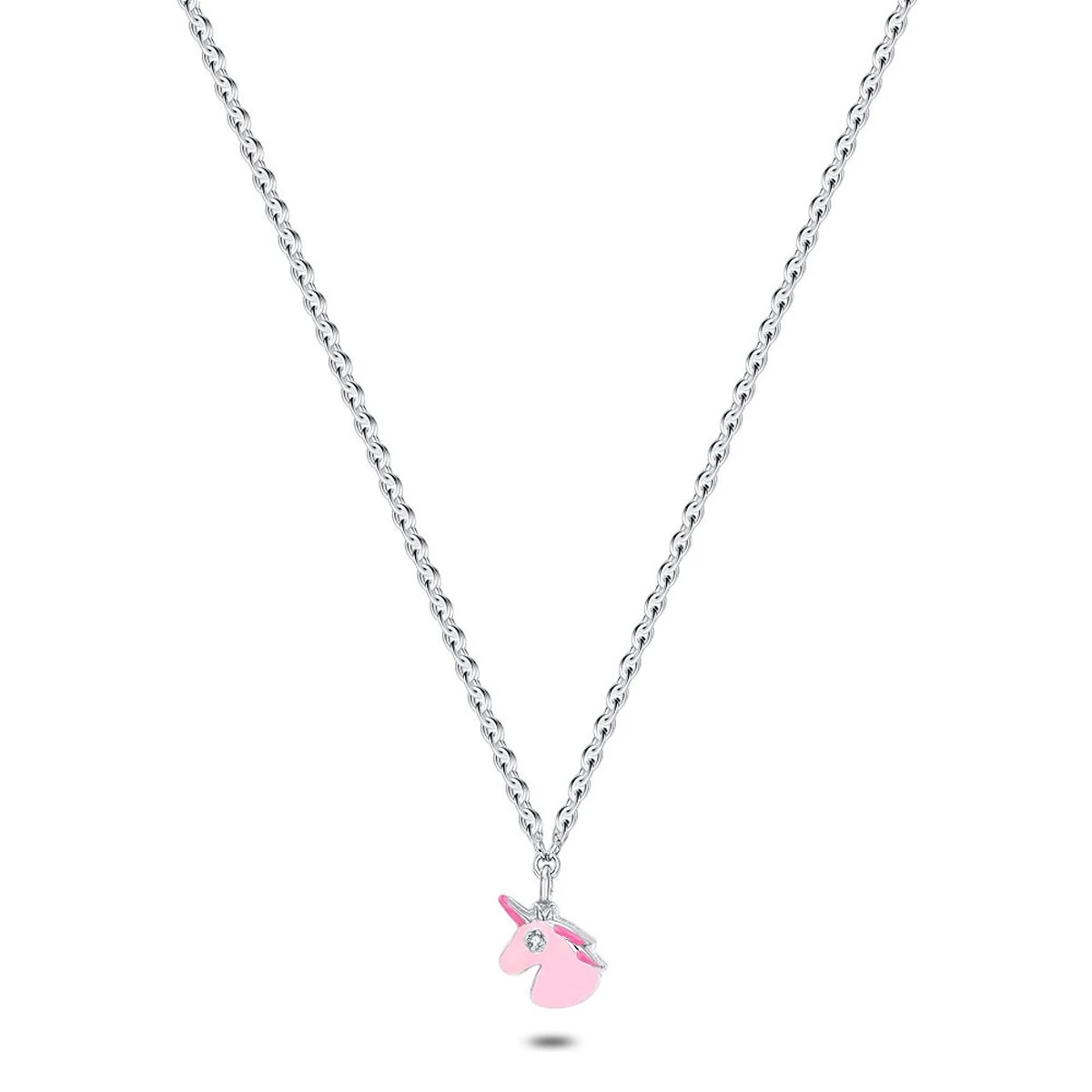 Halsketting in zilver, roze eenhoorn met 1 zirkonia, 10 mm, lengte is verstelbaar.