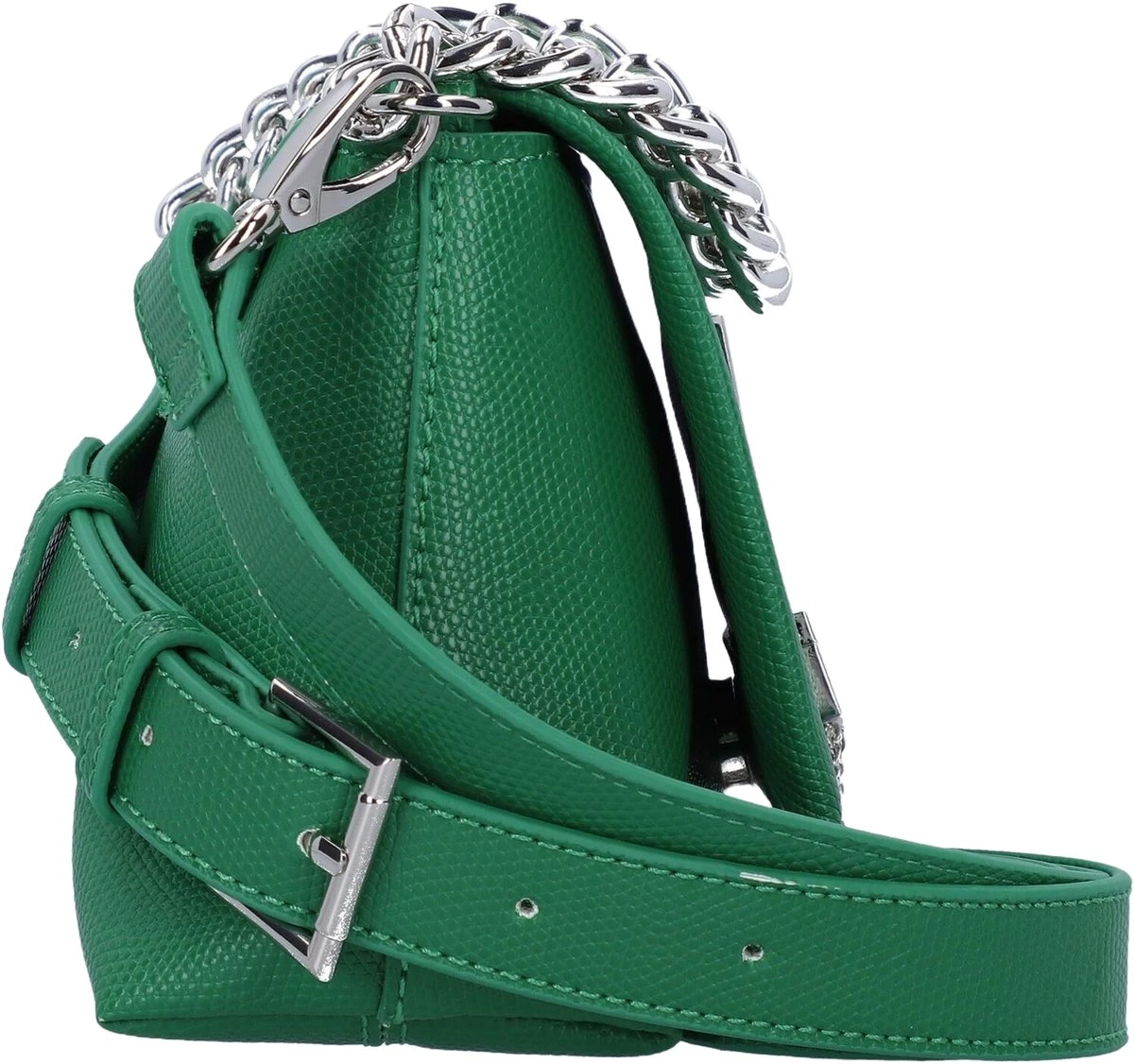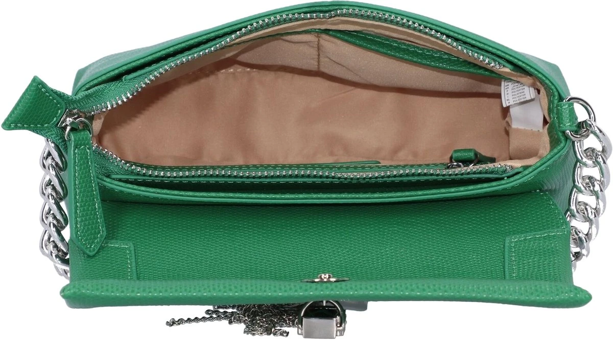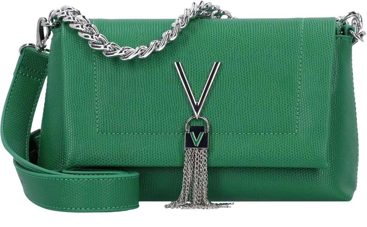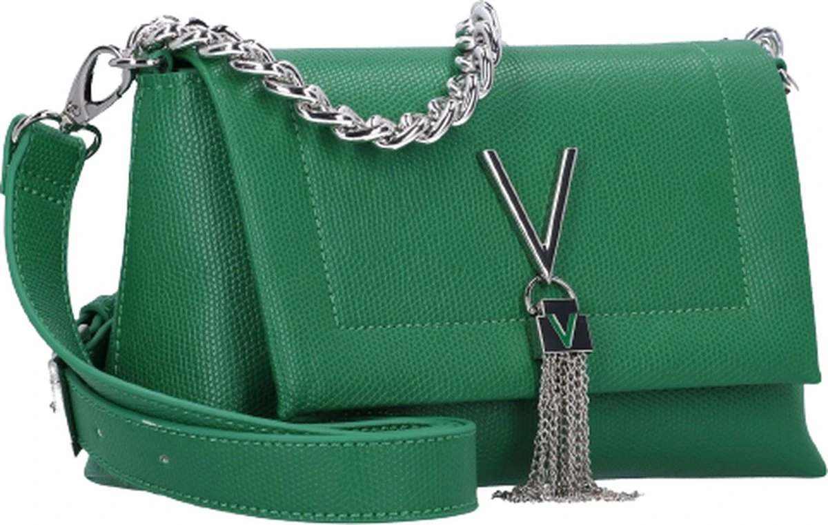 Ruime schoudertas uit volledig gerecylceerd materiaal , gekende Valentino schouderketting en V- met franjes op de overslag met kliksluiting.