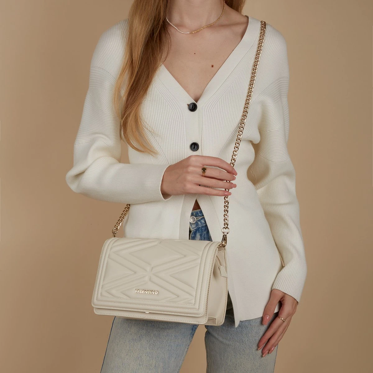 Bij Valentino Bags denk je aan stijlvolle, trendy en chique tassen; gelukkig zijn dat allemaal eigenschappen van deze crossbody ‘Souvenir Re’. Het mooie patroon met de ruitmotieven geeft deze tas een extra flair en laat jouw outfit shinen wanneer jij door de stad loopt. Weetje: deze tas komt niet met één maar met twee schouderbanden, één brede schouderband in de kleur beige en één lange schakelketting.