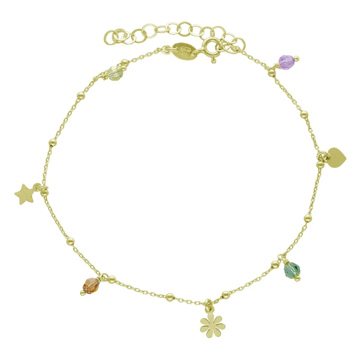 Victoria Cruz A4037-MDB Zilveren Enkelbandje Hartje, Ster, Bloem, Kristal Hangertjes – 26cm – Multikleuren – Ankerschakel – Zilver – Verguld/Goud Op Zilver