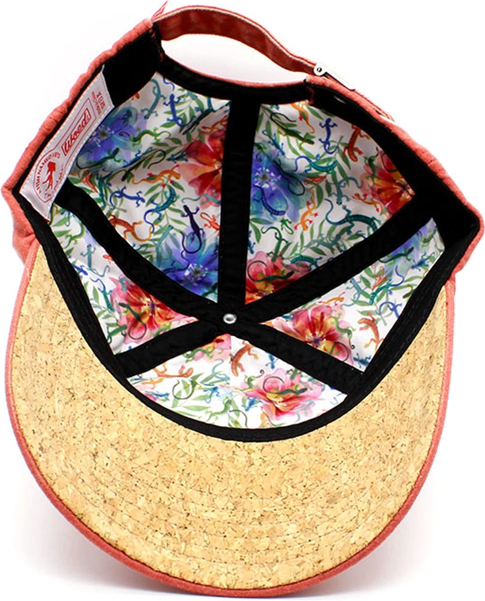 De binnenkant van de pet is voorzien van een opvallend hagediskunstwerk dat een extra leuk element toevoegt aan het ontwerp. De onderrand van de pet is gevoerd met een laagje kurk, wat hem een unieke touch geeft en bovendien extra comfort.